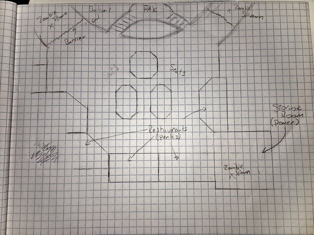I started this project with the intentions of learning how to use the Radiant editor. I wanted to create a level that would challenge me to learn more then just the basics while also being a map players would enjoy and want to play. I first decided upon the mall theme for the level after seeing pictures from inside a real-life abandoned mall. I thought the setting would make for a great level and the food court specifically would be a fun playable area. The food court allowed me to be very creative while also providing some context to the perks by having them be sodas players can purchase at the various restaurants. As the project continued, I shifted the theme away from being ‘abandoned’ and decided to make the mall more modern while keeping the same open layout of the food court.